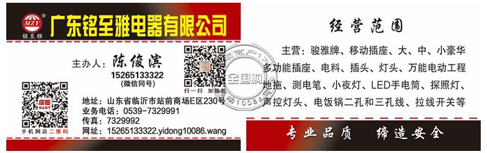 骏雅牌、移动插座、大、中、小豪华多功能插座、电料、插头、灯头、万能电动工程地拖、测电笔、小夜灯、LED手电筒、探照灯、声控灯头、电饭锅二孔和三孔线、拉线开关等